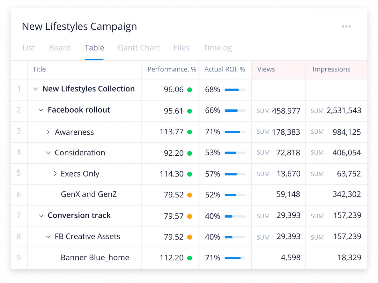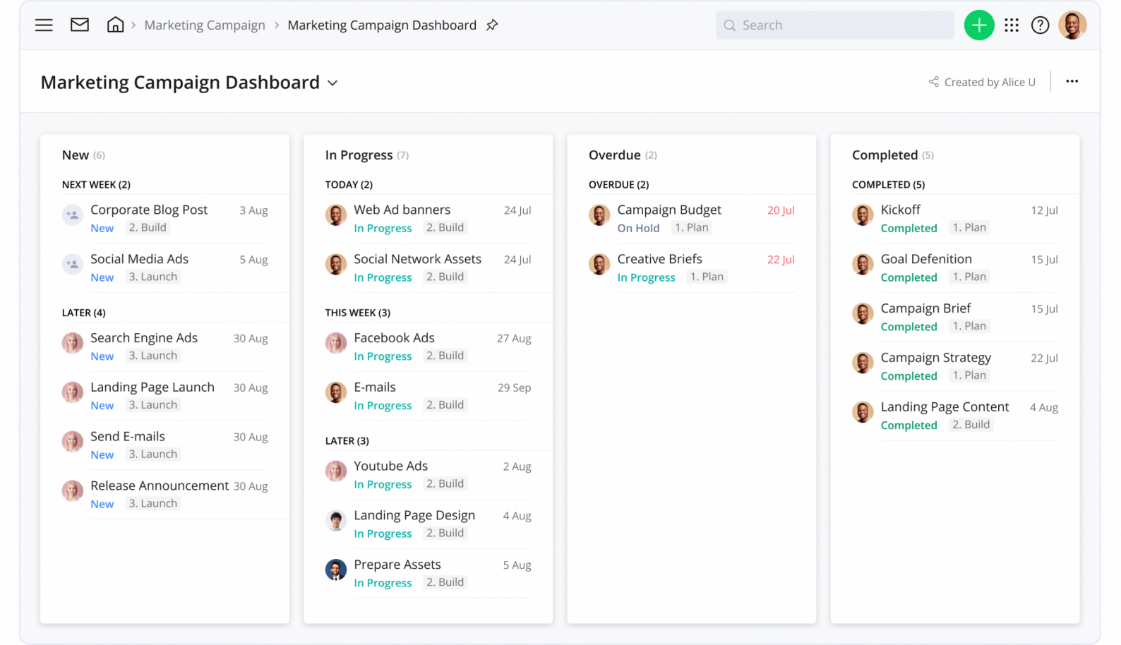 With a solid digital marketing strategy in place, it's time to get to work. Wrike's Marketing Campaign Template allows you to plan, launch, and track performance all in one place. By breaking your strategy down into manageable tasks, streamlining requests and workloads, and clearly displaying deadlines, this template helps teams to hit the ground running with their marketing goals.