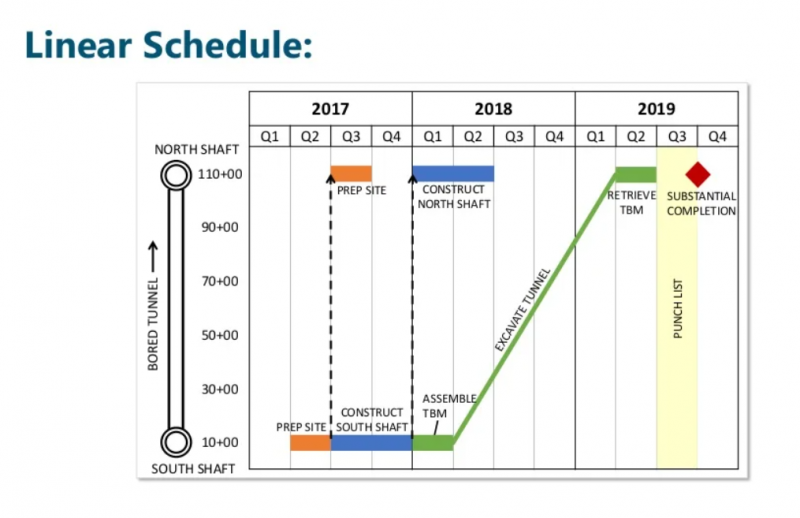 For example, during Q2 of 2017, tunnel site 10+00 will be prepped. Then, in Q3 of 2017, tunnel site 10+00 will be constructed while tunnel site 110+00 is prepped.