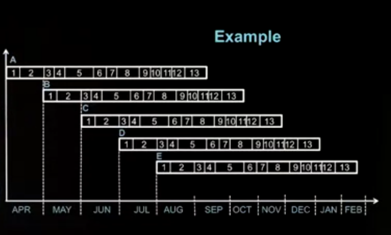 In this linear scheduling method example, “A” represents the beginning of the road, and “E” represents the end of the road. The lettered segments each represent a different section of the road that will be built in order. The numbered bars correspond with a different repetitive process associated with this example road's construction, such as prepping the site and pouring concrete.