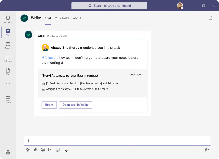 Wrike's integration with Microsoft Teams connects the chat-based workspace of Teams to the work management features of Wrike. In a nutshell, it ties all the discussions you have in your Teams channels to concrete tasks and project plans, which are recorded, monitored, and analyzed with Wrike's powerful tools.