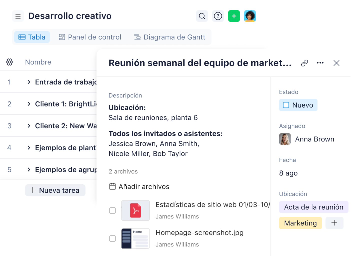 Ambos ejemplos son muy simples, pero las actas de reunión pueden ser tan complejas como necesites. Gracias a la plantilla lista para usar de Wrike, puedes almacenar tus actas de reunión en una plataforma centralizada y segura, con lo que se puede acceder a ellas y consultarlas en cualquier momento.